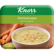 Gemüsesuppe (86%) (Modifizierte Kartoffelstärke, Glukosesirup, jodiertes Salz, Palmöl, Geschmacksverstärker (E621, E631, E627), Laktose (MILCH), Lauch (4%), Zwiebelpulver (3,5%), Zucker, Karotten (2. 7%), Aromen (enthalten SELLERIE), MILCHproteine, Erbsenstärke, Trennmittel (E551, E552), Schnittlauch, Spinatpulver (0,4%), Kurkuma, Säuerungsmittel (E330)), Croutons (14%) (WEIZENmehl (enthält Calciumcarbonat, Eisen, Thiamin, Niacin), Palmöl (Palm, Antioxidationsmittel (E392)), Salz, Hefe).